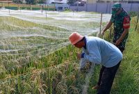 PAMEKASAN – Babinsa Koramil 0826-08/Palengaan, Kopda Hairul Umam membantu Mostofa memperbaiki jaring pengaman padi di Dusun Laccaran, Desa Palengaan Daya, Kecamatan Palengaan, Kabupaten Pamekasan….